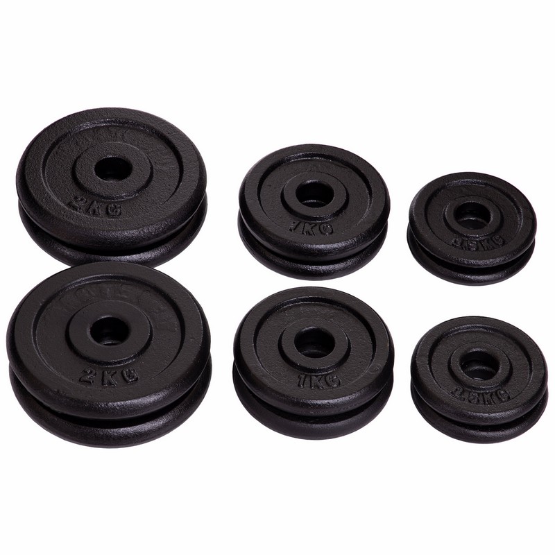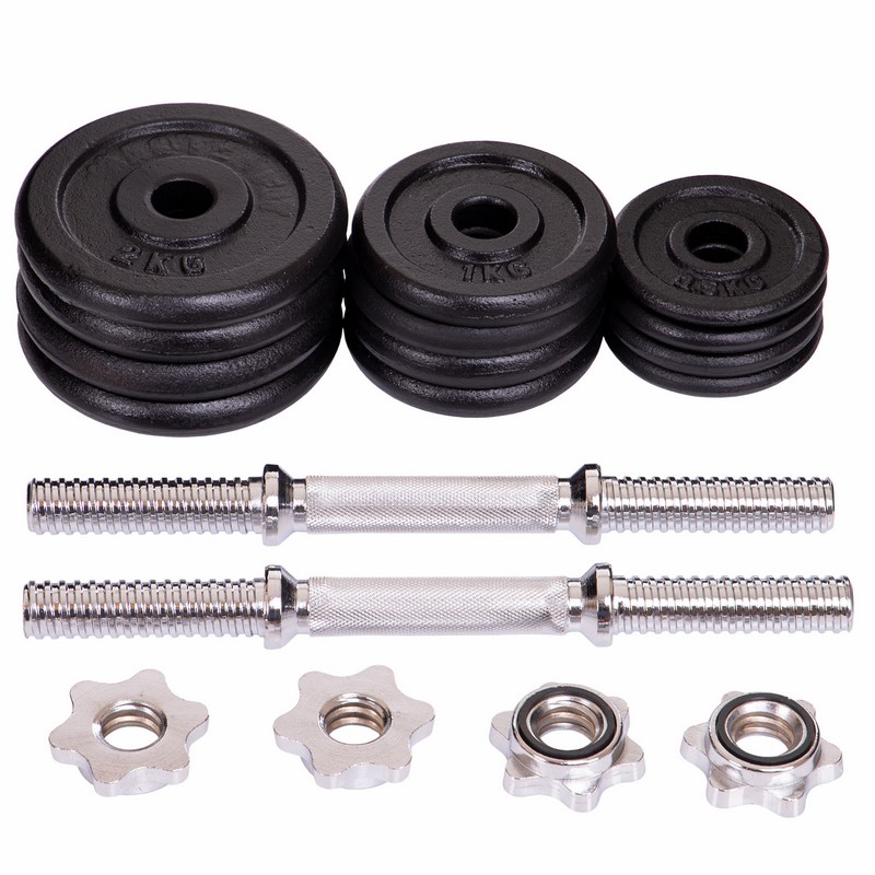 Материал: металл. Вес: 18 кг. (2х9кг) Длина грифа: 30 см. Диаметр грифа: 25 мм. Цвет: чёрный. Назначение: общефизическая тренировка. Комплектация: гриф – 1, 2 шт.; замки – 2, 4 шт.; набор блинов (0,5+1+2кг) – 4 шт.