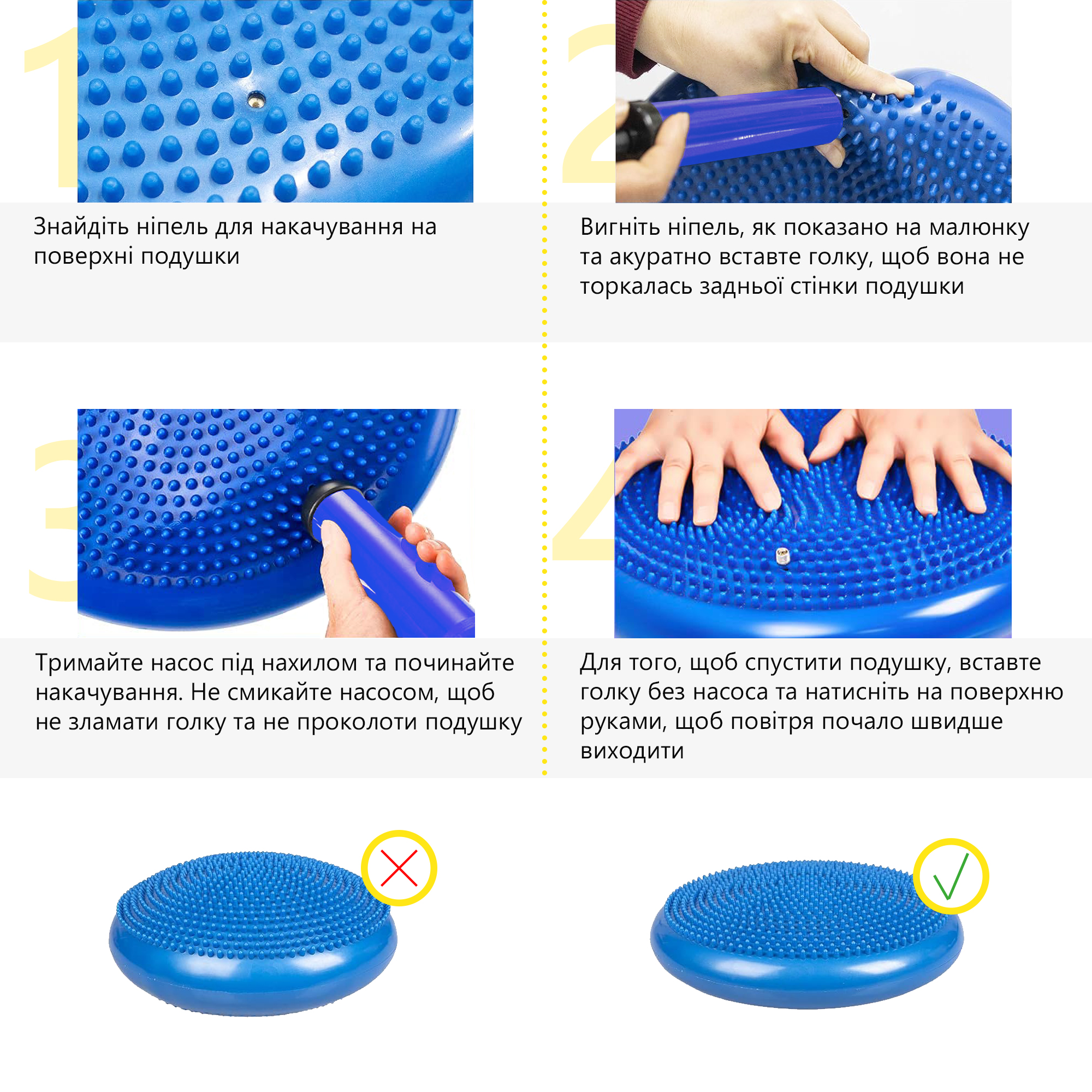 Масажний диск від Cornix виконаний з високоякісного матеріалу ПВХ, він нетоксичний і не викликає алергічних реакцій. Максимальне навантаження - 200 кг, крім того, аксесуар має систему захисту від ковзання, завдяки чому є безпечним та не має обмежень за віком - може використовуватися як дорослими, так і дітьми. Відмінно підходить для масажу рефлекторних зон (ступнів, долонь), зняття стресу. Має спеціальну рельєфну поверхню, що відтворює дію акупунктурного масажу. У комплекті передбачений насос із голкою для накачування подушки до потрібного об'єму.