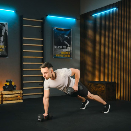 Шестикутна форма гантелей запобігає їх скочуванню по підлозі, що підвищує безпеку та комфорт між підходами. Це особливо важливо під час інтервальних і кругових тренувань. Додатково така форма дозволяє використовувати гантелі як упори для віджимань, урізноманітнюючи тренувальний процес та залучаючи нові м'язові групи.