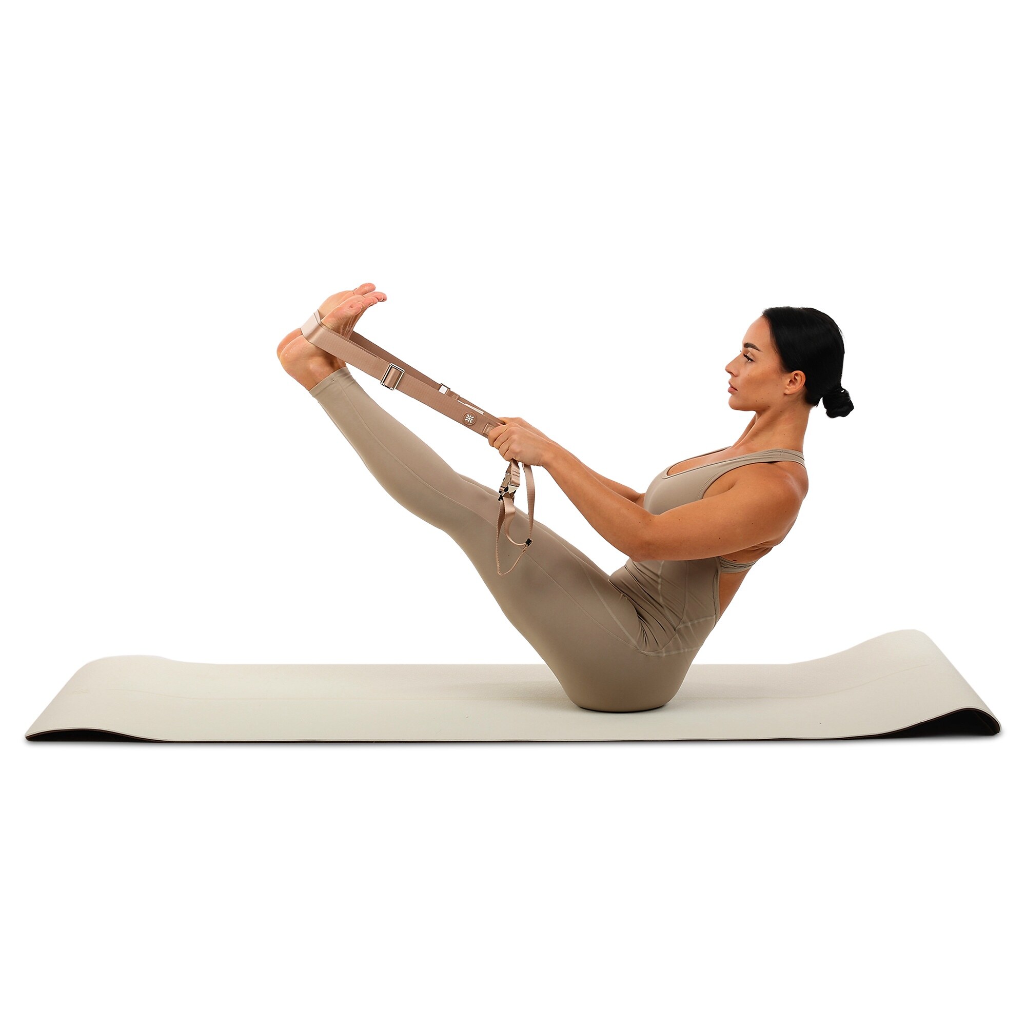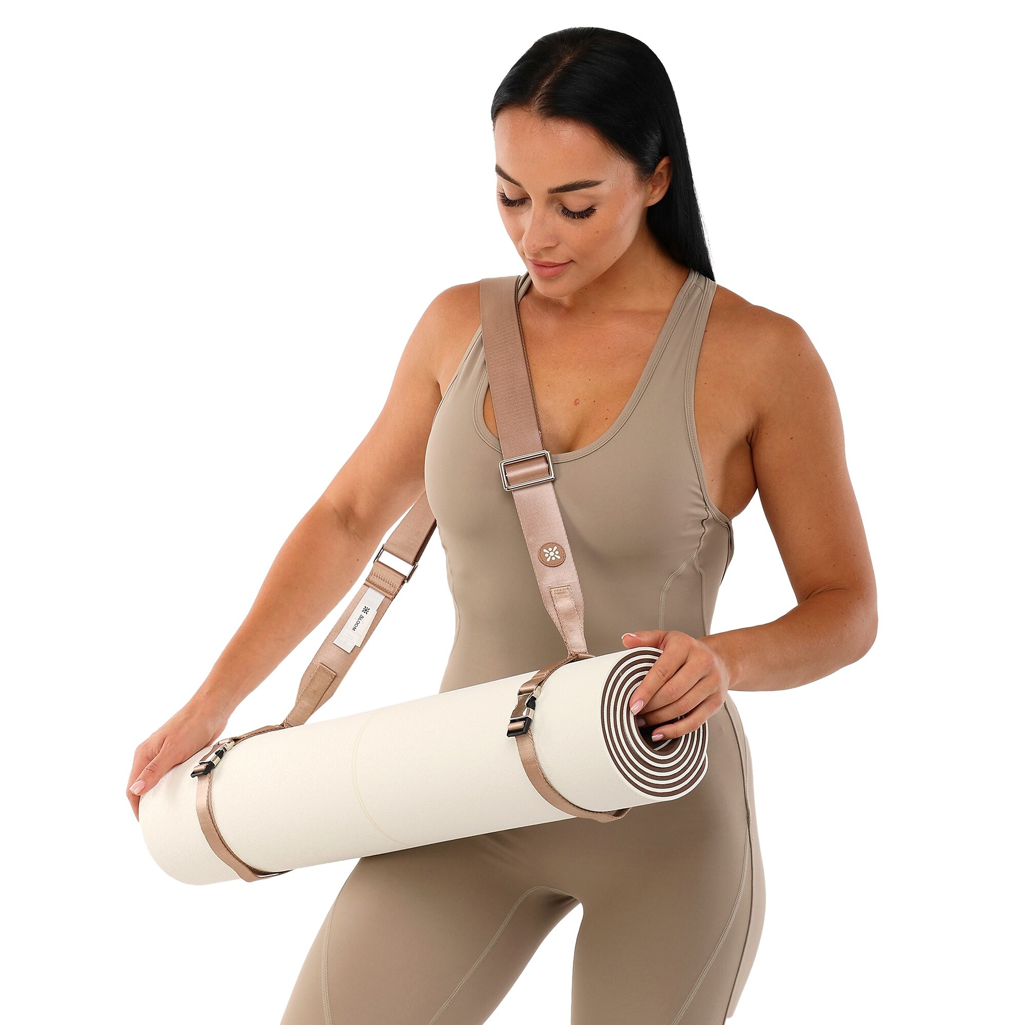 - За допомогою стяжки зручно носити килимок із собою та виконувати вправи на розтяжку.