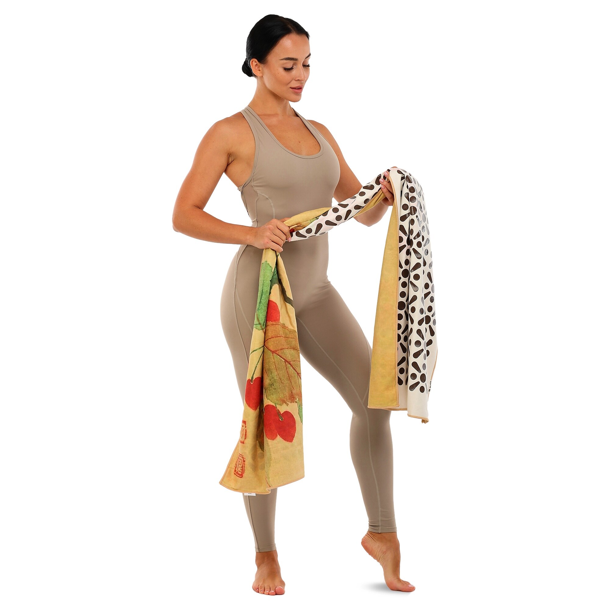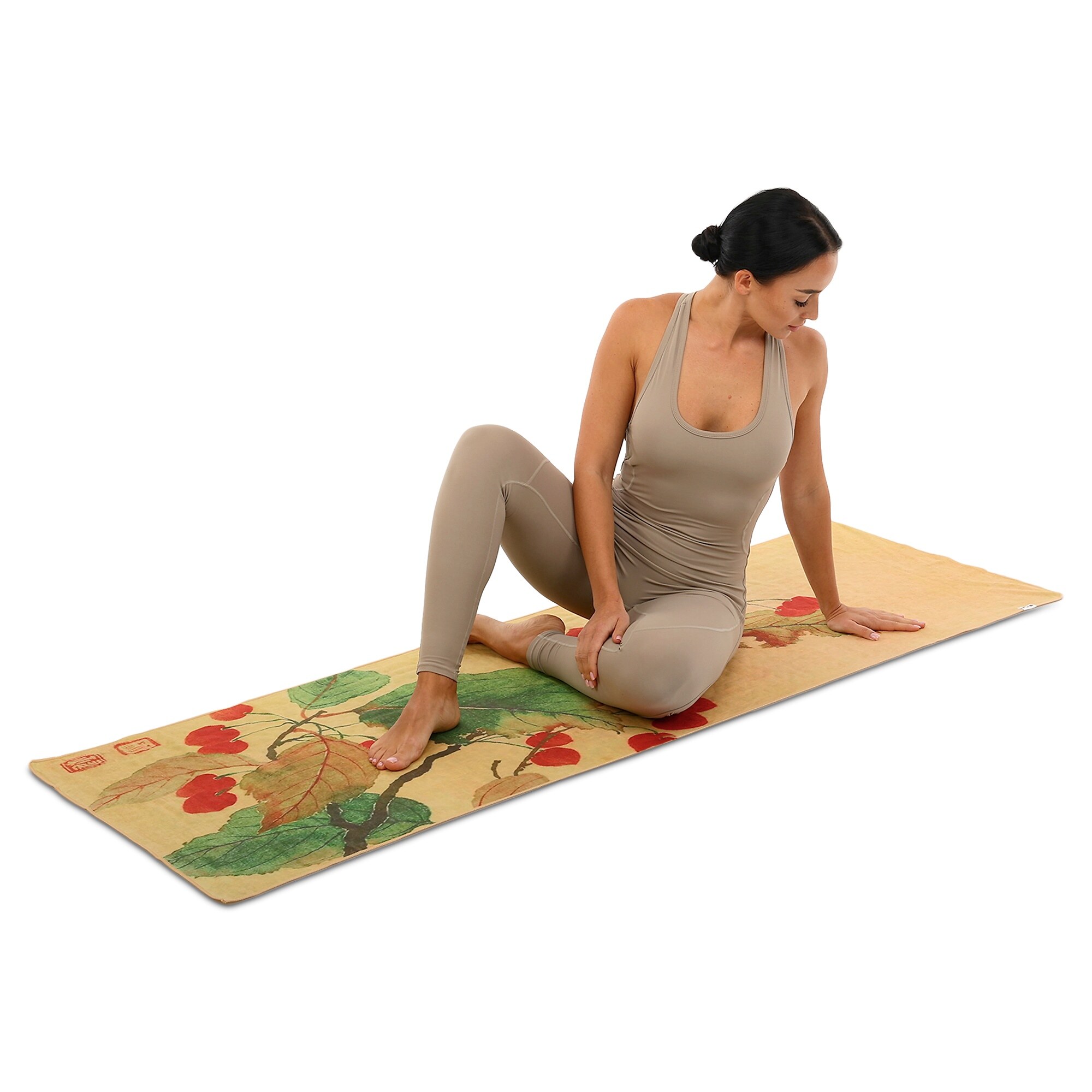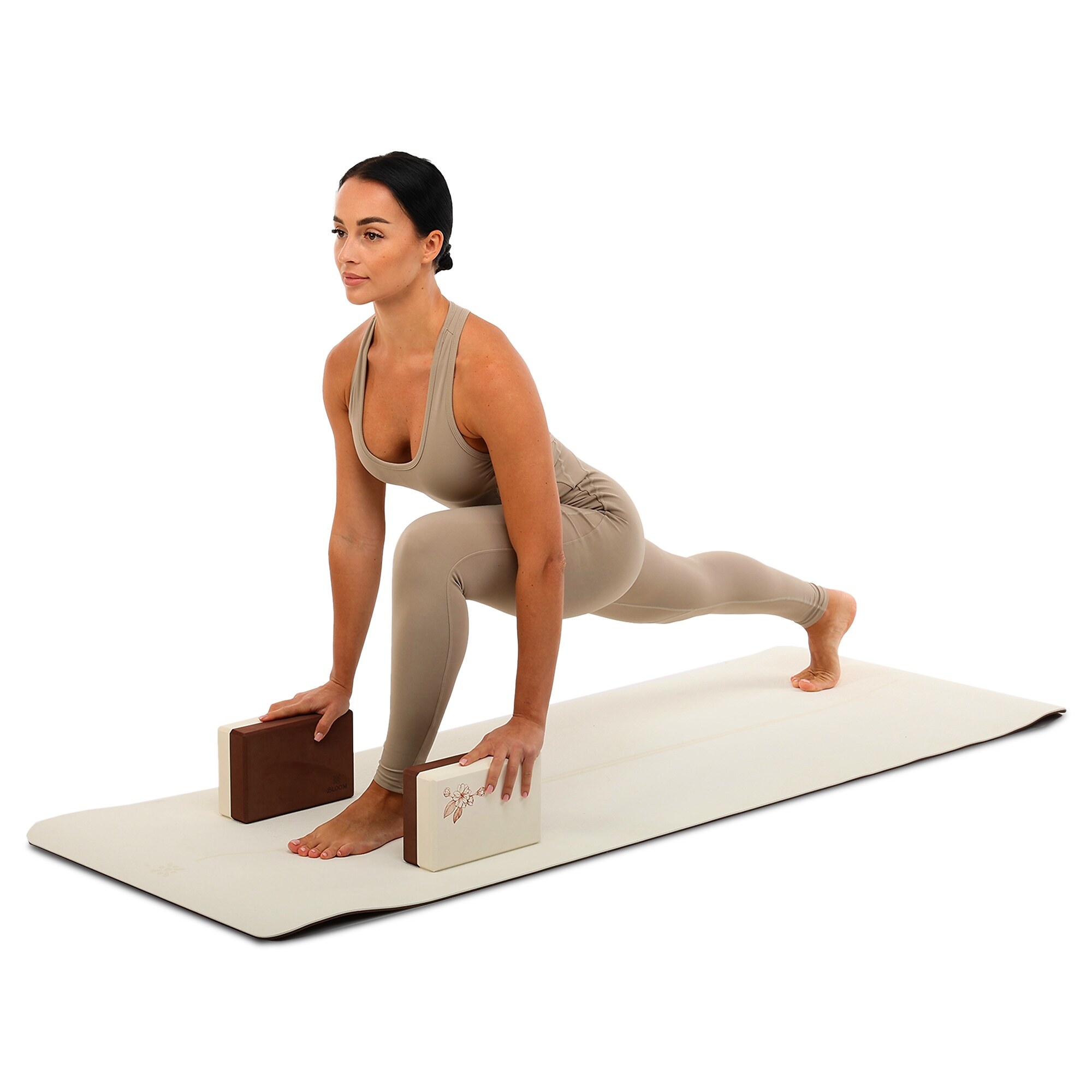 На рушник нанесено малюнок бегонії. Його можна використовувати поверх килимка для додаткового комфорту під час занять йогою. Блоки для йоги дадуть змогу на початковому етапі занять знизити навантаження на суглоби. Стяжку для килимка можна використовувати також під час виконання вправ на розтяжку.
