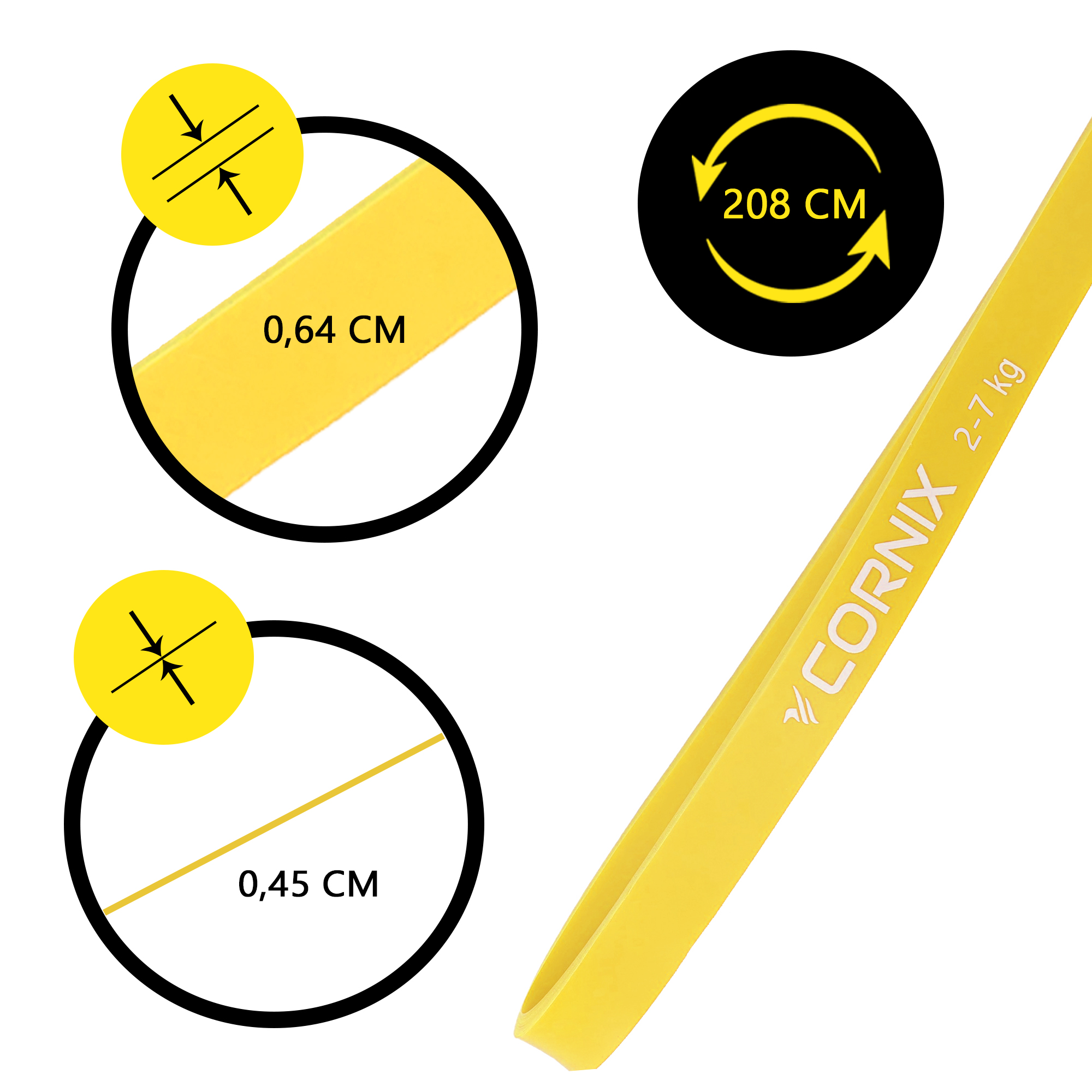 Кожна петля Cornix має стандартну довжину - 208 см по колу та товщину - 4.5 мм, а сила опору визначається шириною. У модельному ряді представлено шість рівнів навантаження - від 2-7 кг до 29-79 кг, що дозволяє підібрати оптимальний набір відповідно до власних цілей: легкі петлі підходять для розминки, середні - для тренувань із власною вагою, а найпотужніші - для силових вправ. Виконані зі 100% натурального латексу преміум-якості, еспандери зберігають форму навіть після інтенсивного використання, не тріскаються і не втрачають еластичність. Опір наростає поступово, забезпечуючи плавне і контрольоване зусилля в усьому діапазоні руху. Робочим рівнем розтягування вважається діапазон 1.5-2.5 рази від початкової довжини, що гарантує максимальну ефективність тренування при стабільному навантаженні. Використовуючи кілька петель одночасно, можна сумувати їхній опір і отримувати нові рівні натягу без купівлі додаткового інвентарю - саме тому набір є найбільш гнучким і практичним варіантом для регулярних занять.