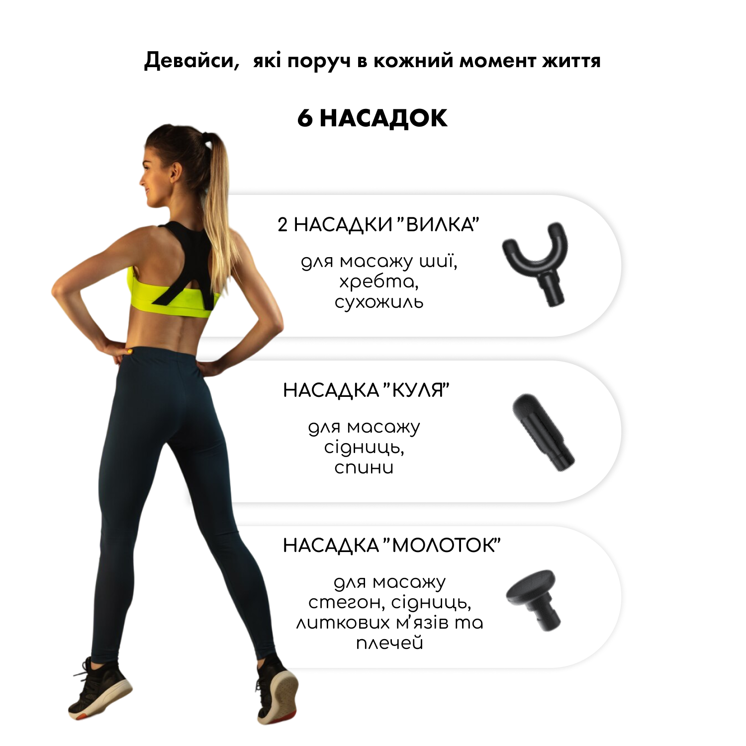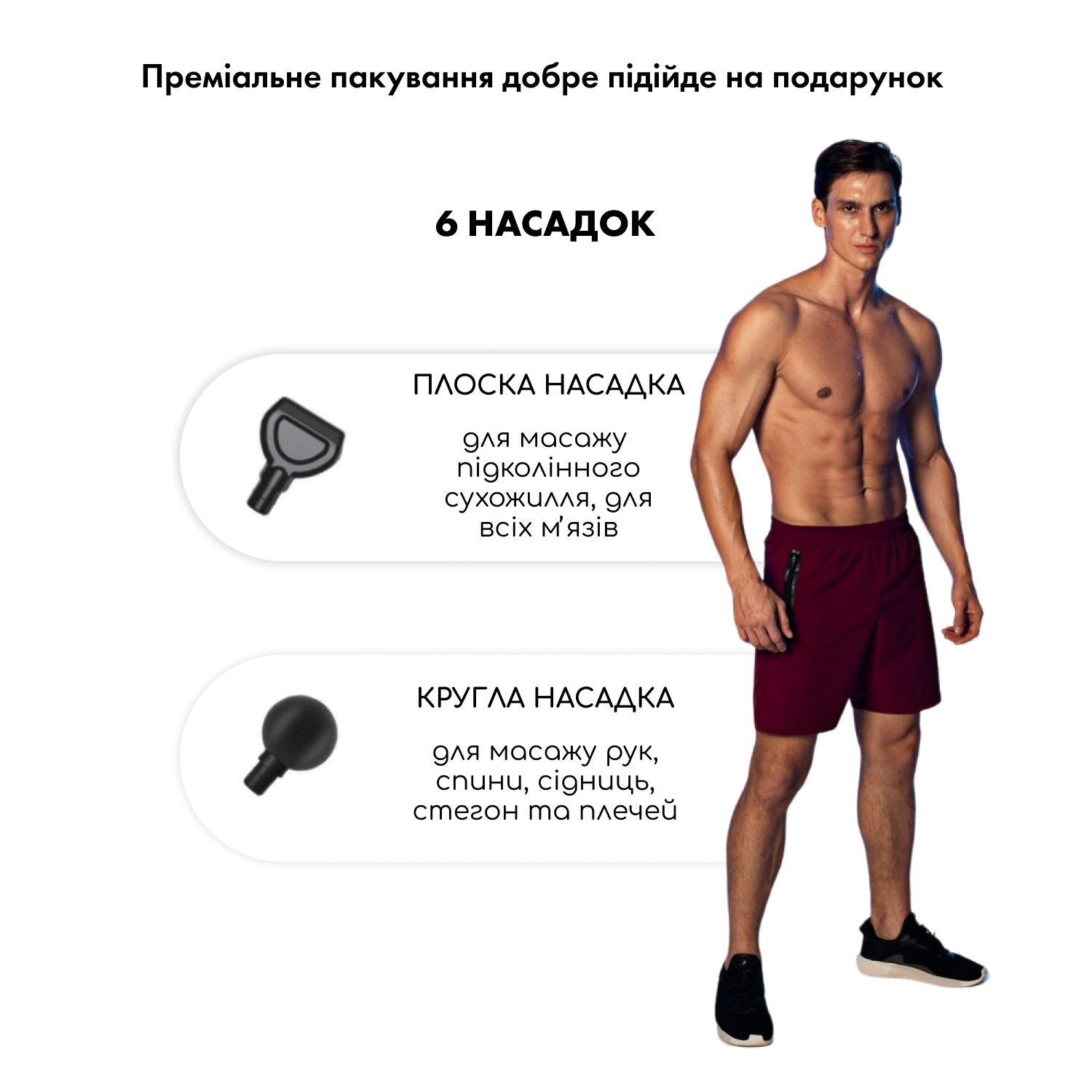 Високотехнологічний функціональний масажер ефективно знімає м'язові спазми, а також збільшує кровообіг, чим у значній мірі зможе скоротити час на відновлення м'язових тканин. Завдяки шести масажних головок, що входять в комплектацію, можна виконувати розслабляючий масаж для відновлення і гарного самопочуття.
