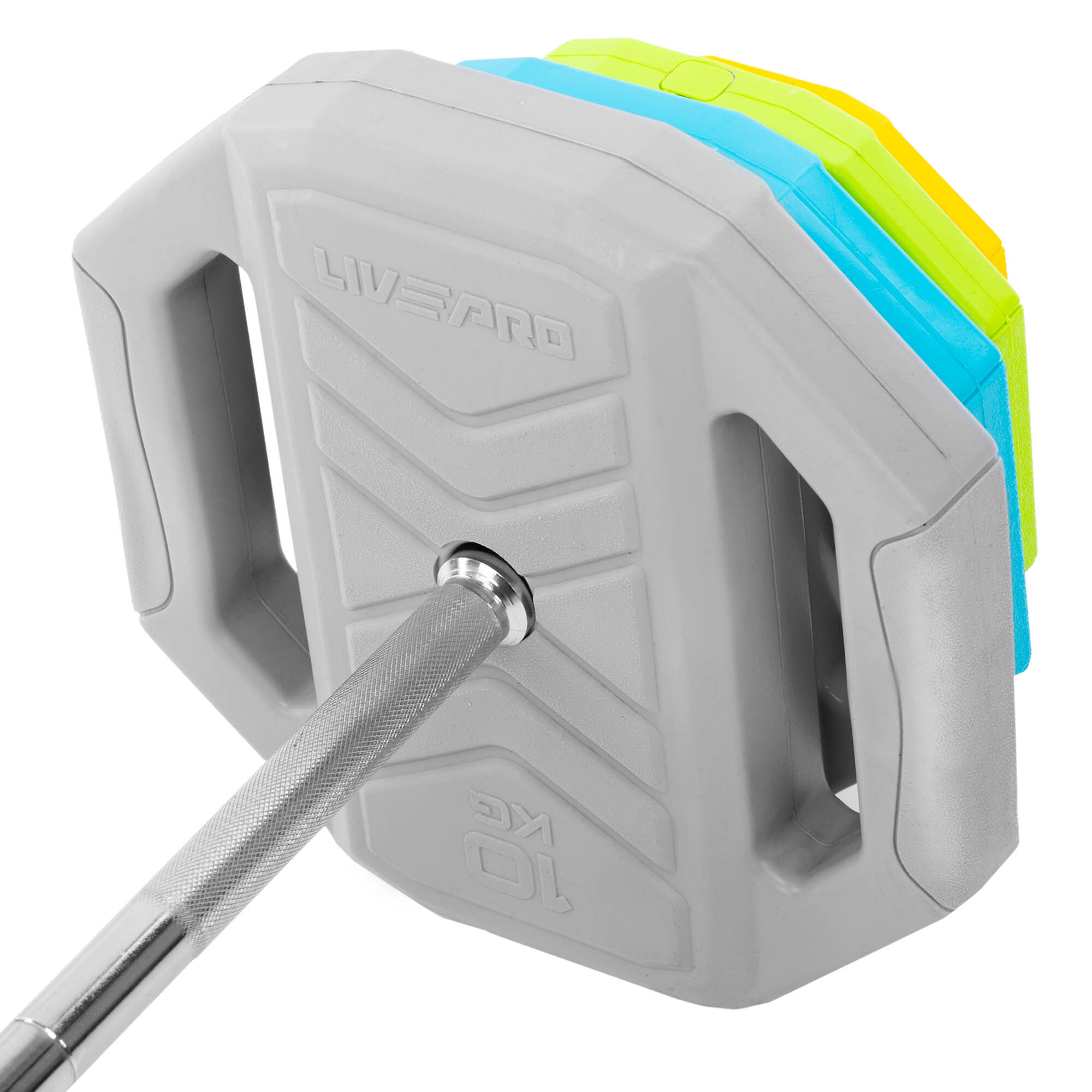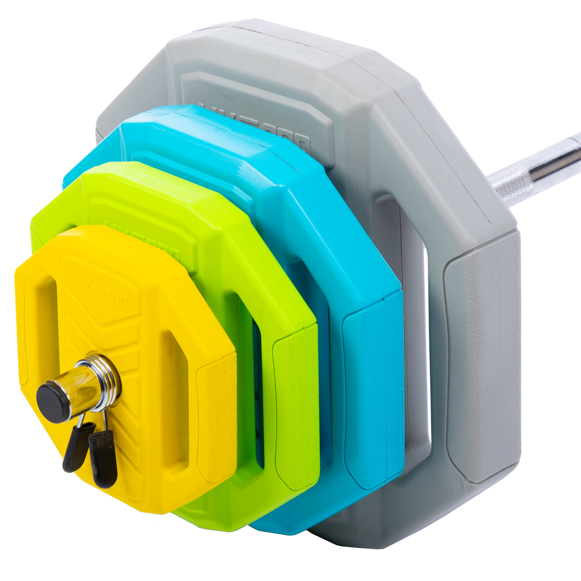 Штанга для фітнесу від бренду LiveUp - це інвентар, який допоможе стати стрункішим і тренуватися за методикою фітнес-памп. Конструкція штанги розбірна, вагу можна регулювати. У комплект поставки входить металевий гриф з насічками для кращого зчеплення з руками, а також комплект дисків. Щоб під час енергійного тренування диски не спадали з грифа, штанга комплектується парою замків. Вони перешкоджають зміщенню дисків штанги.