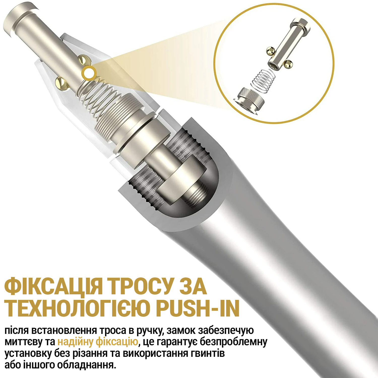 - Трос виконаний з нержавіючої сталі, а для більшої зручності й для того, аби не пошкоджувати підлогу, має покриття з ПВХ.