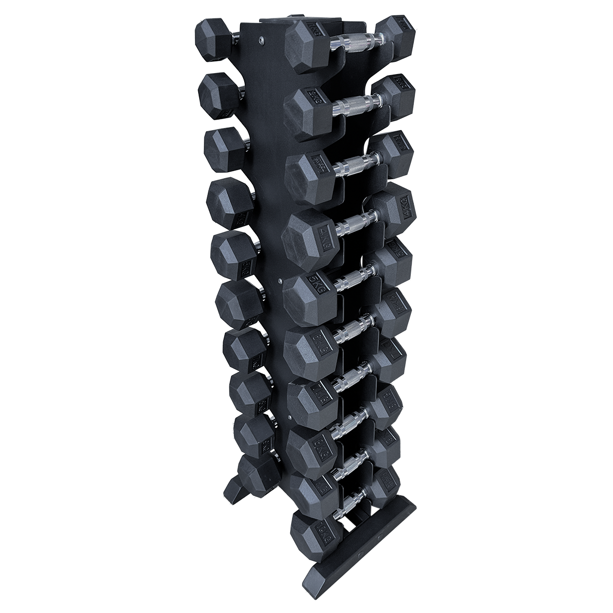 Якщо ви займаєтесь з гантелями не лише вдома, а й хочете обладнати власний спортивний куточок, тоді вам знадобиться стійка. Професійна та якісна, створена з міцного металу, вона оптимально підійде для зберігання шестигранних гантелів. Набору від 1 кг до 10 кг по парі.